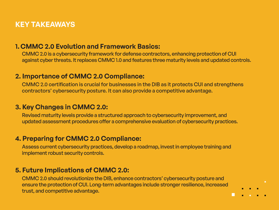 CMMC 2.0 should revolutionize the DIB, enhance contractors’ cybersecurity posture and ensure the protection of CUI. Long-term advantages include stronger resilience, increased trust, and competitive advantage.